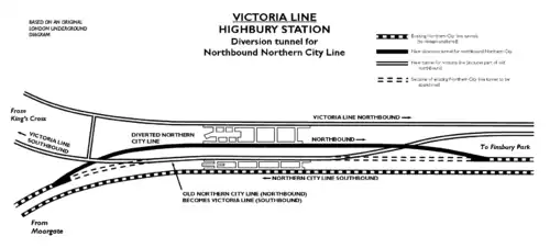 De acht sporen van het spoorwegstation en het metrostation bij Highbury & Islington zijn doorgenummerd 1 t/m 8. De sporen 3 t/m 6 liggen op 18 meter diepte onder de zuidpunt van Highbury Fields op 3,6 km ten noorden van Moorgate. Door de beoogde overstapfunctie van de Victoria Line zijn ze per rijrichting paarsgewijs verbonden met een verdeelhal tussen de perrons van het dubbelgewelfdstation. De diensten op de Northern City Line worden verzorgd door Great Northern. De verdeelhallen zijn met vaste trappen verbonden met reizigerstunnels boven de sporen. Door de twee parallelle tunnels zijn instappers en uitstappers tussen perron en roltrap gescheiden. De roltrapgroep tussen de reizigerstunnel en de stationshal van het gemeenschappelijke stationsgebouw ligt schuin onder Holloway Road.