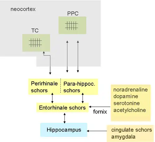 De definitieve opslag van kennis in het langetermijngeheugen vindt vermoedelijk niet plaats in de hippocampus zelf, maar hogerop, in gebieden van de neocortex zoals de pariëtale en temporale cortex (zie figuur hiernaast).