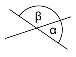Wanneer twee lijnen in een vlak elkaar snijden, worden door deze lijnen vier hoeken gevormd. De overstaande hoeken zijn daarbij in grootte aan elkaar gelijk. Twee aangrenzende hoeken zijn samen 180° en de vier hoeken, die door de twee lijnen worden bepaald, vormen samen een cirkel. De hoek tussen twee lijnen kan op twee manieren worden gemeten. Meestal, maar niet noodzakelijk, wordt onder de hoek de kleinste hoek verstaan, in dit geval hoek .