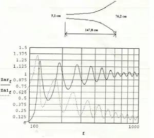 waarin c de snelheid van het geluid is in m/sec, wordt de resistieve component van de impedantie verwaarloosbaar, zodat zich geen geluid meer door de hoorn voortplant. De akoestische impedantie is nu zuiver reactief. Bij hogere frequenties dan de afsnijfrequentie wordt de totale impedantie geven door