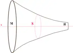 De kleinste opening of aanvangsopening van een hoorn wordt de hals (H) of keel genoemd en de grotere uittreeopening de mond (M). De rechte tussen het midden van de hals en de mond noemt men de hoornas (x) en de afstand tussen hals en mond op deze as is de hoornlengte. Van hals tot mond varieert het oppervlak van de doorsnede (S) volgens een bepaalde wet in functie van de afstand tot de hals. Deze wet kan cilindrisch (constante doorsnede), parabolisch, conisch, exponentieel, hyperbolisch zijn of een ander toenemend verloop hebben. In praktische ontwerpen is de akoestische koppeling van de hals met de geluidsbron van groot belang. Om de stralingsimpedantie zo veel mogelijk resistief (onafhankelijk van de frequentie) te maken, moet tevens de omtrek van de mond groter zijn dan de golflengte van de laagste toon die de hoorn moet uitstralen. Dit betekent dan ook dat de lengte voldoende groot moet zijn.
