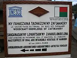 De kennis van houtsnijwerk van de Zafimaniry of het heilige hout van de Zafimaniry uit Madagaskar staat sinds 2003 vermeld op de Lijst van Meesterwerken van het Orale en Immateriƫle Erfgoed van de Mensheid van UNESCO. De traditie, overgedragen van de ene generatie op de volgende, is zichtbaar op elk gebouw en elk voorwerp van hout.