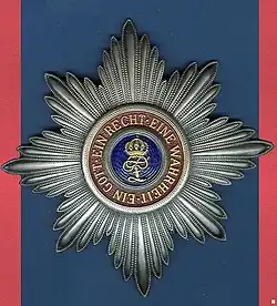 - De ster is van zilver, in en enkel geval van goud, en heeft achttien stralen. De diameter is 10½ centimeter en de zilveren ster is iets gewelfd. De lancetvormige stralen zijn fraai bewerkt met een parelrand en zodanig geplaatst dat de ster acht punten heeft. In het midden van de ster is een groot medaillon, gelijk aan dat van het kleinood, geplaatst. In het geval van een verlening van een grootkruis of een grootcommandeurskruis met de zwaarden worden twee ontblote zilveren zwaarden met gouden gevesten op de diagonale stralen gelegd. De ster van de grootkruisen werd op de linkerborst gedragen terwijl de grootcommandeurs een ster op de rechterborst droegen. Er zijn sterren bekend die met diamanten werden bezet. Dergelijke onderscheidingen met briljanten werden incidenteel aan staatshoofden of bij wijze van kostbaar geschenk verleend. Zij kunnen niet worden gezien als een graad in de orde.