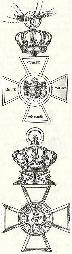 In 1838 waren er vier graden, Großkreuze, Großkomture, Komture en Kleinkreuze. Deze graden kwamen en de "Erste und Zweite Ordensklasse", die van de Kappitulare en die der Ehrenritter voor. De orde werd al in 1841 hervormd. In dat jaar werden Grootkruisen met en zonder kroon ingesteld. In 1856 kwam de mogelijkheid om het Eretekruis der Eerste Klasse ook met een gouden kroon te verlenen. In 1869 werden de Kleinkreuze ridders in twee graden waarbij alleen de Eerste Klasse ook kapittelridder kon zijn.