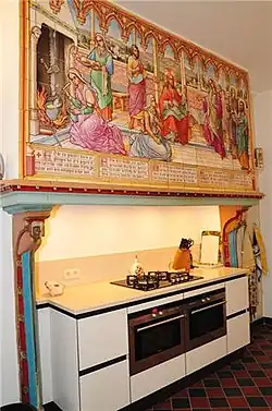 Verder bevat het pand beschilderde tegeltableaus ook door het atelier Coucke gemaakt.