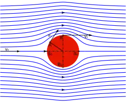 Figuur 1: potentiaalstroming met stroomlijnen rond een cilinder in een wrijvingsloze vloeistof
