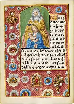 - f.331v: De heilige Anna zittend, lezend in een boek met voor haar Maria met het Christuskind op haar schoot. De pagina heeft een strooirand met juwelen.
