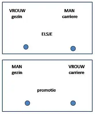 - In serie B zijn de reacties omgekeerd: nu moet met de ene hand worden gereageerd op ‘insecten’ en ‘prettige woorden’ en met de andere hand op 'bloemen' en 'onprettige woorden'. Dit heet de incompatibele of de incongruente conditie (bloemen en onprettig horen eigenlijk niet bij elkaar, evenmin als insecten en prettig). Op de dia staan nu 'bloemen' of 'onprettige woorden' links op de dia, en 'insecten' of 'prettige woorden' rechts op de dia. Of (in de andere IAT-versie) de combinatie 'man' en 'gezin' staat links en de combinatie 'vrouw' en 'carrière' rechts.