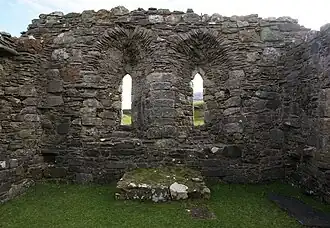 De toegang tot de kerk bevindt zich aan de westelijke zijde van de noordelijke muur. Deze ingang was ooit onder meer versierd met een gepunte boog.[1] Er bevinden zich twee spitsboogvensters aan de oostzijde; dit is kenmerkend voor simpele kleine kerken in de westelijke hooglanden.[2] Aan de oostelijke zijde van zowel de noordmuur als de zuidmuur bevindt zich een raam.