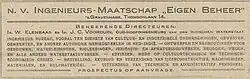 De Maatschap stelt zich voor ook op te treden als Ingenieurs-Bureau. Voorlopig kan de Maatschap zich, wat Ned.-Indië betreft, enkel belasten met het opmaken van ontwerpen, waarvoor de gegevens reeds te voren door anderen werden verzameld. Zij stelt zich echter voor al spoedig aldaar connecties te zoeken en binnen niet te langen tijd vertegenwoordigers aan te stellen, zoodat zij tevens alle voorbereidende werkzaamheden kan doen verrichten, noodig voor het geven van adviezen, het opmaken van ontwerpen op allerlei gebied en het uitvoeren van werken.