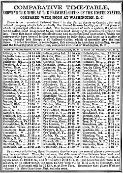 In de meeste landen werden rond 1800 nog lokale tijdrekeningen in acht genomen en vaak fervent verdedigd.[1] Toen men zich te voet of per paard en wagen verplaatste was dit op zijn hoogst wat onhandig, maar met de komst van de spoorwegen aan het begin van de negentiende eeuw werd het ronduit ondoenlijk.[2] Zo had België in 1836 een project ondernomen om tot een kleiner aantal nauwkeurigere lokale tijden te komen. In het Verenigd Koninkrijk namen de spoorwegen in 1840 het voortouw door met een nationale tijd voor stations en treinen te komen. Vanaf 1847 verzond de "Post Office" vanuit Greenwich telegraafsignalen naar alle uithoeken van het land om synchronisatie van klokken mogelijk te maken. Het duurde overigens tot 1890 voordat Greenwich Mean Time een wettelijke basis kreeg. Getuige de tabel hiernaast was de situatie in de Verenigde Staten mogelijk nog minder overzichtelijk. In Nederland werd pas in 1909 op een wettelijke nationale tijd overgeschakeld.