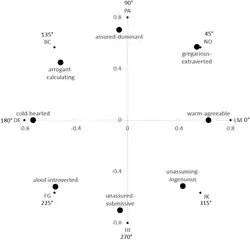 [The circumplex] may also be taken to be a formal geometric model of the interrelations among indicants of constructs derived from an interpersonal theory of personality. Wiggins, J.S.; Phillips, N.; Trapnell, P. (1989): 'Circular reasoning about interpersonal behavior: Evidence concerning some untested assumptions underlying diagnostic classification' in Journal of Personality and Social Psychology, Volume 56, Issue 2, p. 296-305
