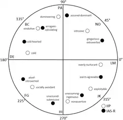 Vanaf 1977 ontstond er echter hernieuwde aandacht.[31] In 1982 waren er 21 verschillende modellen die met de circumplex werkten die onafhankelijk van elkaar ontwikkeld waren.[32] Daaronder waren de Interpersonal Adjective Scales (IAS) van Jerry S. Wiggins die zouden uitgroeien tot de meest invloedrijke versie. Wiggins had deze gebaseerd op de 1710 bijvoeglijke naamwoorden die Lewis Goldberg had gebruikt om persoonlijkheidstrekken te beschrijven.[33] Daarvan werden er zo'n 800 gevonden die binnen de schaal sociale status of liefde vielen en deze werden uitgezet in de circumplex van Guttman. Aanvankelijk werden deze ingedeeld in de categorieën van Leary, maar uit multivariate analyse bleek dat deze categorieën niet voldeden aan het criterium van een gelijke afstand in een hoek van 45°. Een aantal paren van persoonlijkheidstrekken stond veel dichter bij elkaar gegroepeerd, terwijl andere paren veel verder uit elkaar werden stonden dan het model van Leary – waarbij de factoranalyse nog met de hand was gedaan – voorspelde. Wiggins had zijn eigen metingen van interpersoonlijke eigenschappen afgeleid van de sociale uitwisselingstheorie van Foa en Foa, de resource theory of social exchange.[34] Deze kwamen nauw overeen met het ideaal van een equidistant cirkelvormig cluster. Zo werden octanten gevonden die de labels kregen van ambitious-dominant, gregarious-extraverted, warm-agreeable, unassuming-ingenuous, lazy-submissive, aloof-introverted, cold-quarrelsome en arrogant-calculating.[35] In de aangepaste IAS-R werden dit assured-dominant, gregarious-extraverted, warm-agreeable, unassuming-ingenuous, unassured-submissive, aloof-introverted, cold-hearted en arrogant-calculating.[30] Elke term is daarbij weer opgebouwd uit meerdere termen.