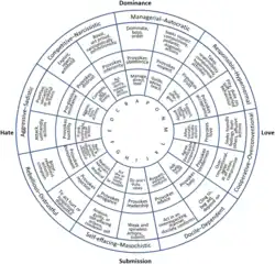 Het interpersoonlijk circumplex is een grafiek in de vorm van een cirkel met sectoren met daarin persoonlijkheidstrekken of gedrag die van toepassing zijn in interpersoonlijke situaties.[4] Er zijn vele verschillende soorten cirkels, variërend van 4, 8 tot 16 sectoren. De horizontale as is veelal de mate van verbondenheid of affectie – ook wel weergegeven als afstand-nabijheid – terwijl de verticale as meestal de mate van dominantie en volgzaamheid weergeeft, ook wel weergegeven als boven-onder.