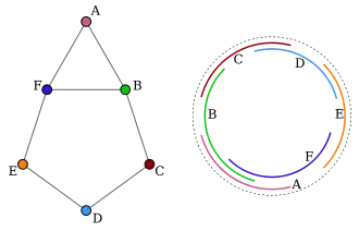 - Cirkelbooggrafen (Engels: circular-arc graphs) stellen de overlappingen voor van bogen op een cirkel. Ze vormen een veralgemening van intervalgrafen. Indien er een punt op de cirkelomtrek is dat niet tot een boog behoort, kan de cirkel in dat punt doorgeknipt worden en uitgerold tot een rechte, wat resulteert in een intervalgraaf (dat is bijvoorbeeld in de figuur hiernaast niet mogelijk). Hoewel cirkelbooggrafen veel lijken op intervalgrafen, zijn er belangrijke verschillen: cirkelbooggrafen zijn niet altijd perfecte grafen.