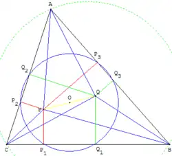 - Neem de voetpuntsdriehoek van P. De lijnen door de hoekpunten van ABC loodrecht op de corresponderende zijden van de voetpuntsdriehoek snijden elkaar in de isogonaal verwante van P,