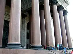 De monolithische granieten blokken waaruit de zuilen werden vervaardigd kwamen uit een groeve in Finland. Ze werden op platbodems vervoerd over de Finse Golf tot aan de kade vlak bij de werf en daar bewerkt en gepolijst tot zuilen. Speciale stellingen werden gebouwd om de zuilen overeind te hijsen. De tsarenfamilie was aanwezig toen de eerste zuil werd geplaatst (20 maart 1828). De kathedraal telt 16 zuilen in zowel het noord- en zuidportaal en acht aan de oost- en de westkant. Iedere zuil is vervaardigd uit een enkel stuk graniet, weegt 114 ton met een hoogte van 17 meter en een diameter van 1,8 meter. In totaal zijn 112 monolithische zuilen van verschillende afmetingen in de kathedraal verwerkt.