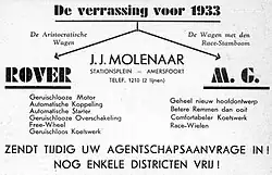 Naast de andere merken verkocht J.J. Molenaar vanaf begin 1932 MG’s en op 1 januari 1933 werd hij officieel importeur van dat merk. In 1936 stopte de Morris-vestiging in Delft met leveren en mede door de persoonlijke contacten van J.J. Molenaar met William Morris werd de import van Morris-personenauto’s en vrachtwagens overgedragen aan zijn bedrijf.