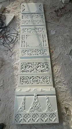 De marmerblokken werden gebeeldhouwd in Ahmedabad, de hoofdstad van Gujarat.[11] Het marmer was afkomstig van Makrana, en van het type waarmee ook de Taj Mahal werd gebouwd.[12] In Ahmedabad werkten tot aan een zware aardbeving in 2001 zo’n tweehonderd Indiërs aan de tempel. Het beeldhouwwerk waarmee de marmerblokken werd versierd, was bijna volledig met de computer ontworpen. Terwijl de blokken op een platform ronddraaiden, werden ze geciseleerd door een computergestuurde boor. Sommige stukken werden met de hand bewerkt door traditionele ivoorsnijders.[11] De blokken werden met schepen naar de Antwerpse haven vervoerd, waar in 2001 het eerste schip aankwam.[13]