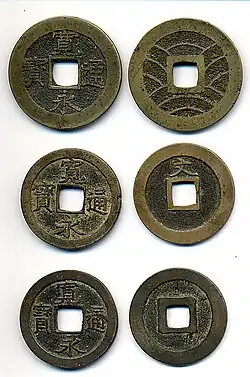 | Kan’ei Tsūhō[34][35] | 寛永通寳 | 寛永通宝 | 1626 (1 mon) 1768 (4 mon) | Kan'ei 5 (1 mon) Meiwa 5 (4 mon) | 1 mon 4 mon | |