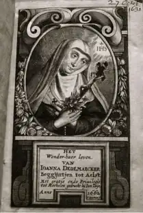 - ↑ F. van Schonenberg: Het Seltsaem ende wonderbaer leven van Joanna Dedemaecker Eertyts Beggyntjen in’t beggyn-hof van Aelst. Dienende in desen tyt als eene perfecte modelle voor alle beggyntiens ende Godt-minnende Sielen. Mechelen: Jan Jaye, 1662.