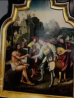 Job is centraal afgebeeld, zittend in een verstilde houding, terwijl zijn vrienden hem omringen en musiceren. Hun instrumenten en gebaren vormen een contrast met Jobs zwijgende innerlijke kracht. De stijl vertoont laatgotische detaillering met invloeden uit de Italiaanse renaissance, zichtbaar in de compositie en emotionele diepgang.