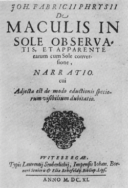 - Joh. Fabricii Phrysii De Maculis in Sole observatis, et apparente earum cum Sole conversione, narratio, etc. Witebergae, Anno M.DC.XI.(jaar 1611).
