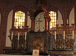Het hoogaltaar is van marmer en op de tabernakeldeur is het verhaal van de Emmaüsgangers afgebeeld. Links en rechts van het tabernakel zijn op de kaarsenbanken de twaalf apostelen afgebeeld. Ook staat hier de tekst "Altare privilegiatum quotidianum perpetuum". Dat betekent dat er een volledige aflaat werd verleend voor de overledenen voor wie er op dit altaar een Mis werd opgedragen. Op de mensa is het offer van Melchisedek afgebeeld.