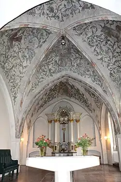 De van oorsprong romaanse hallenkerk werd met veldstenen gebouwd en kreeg in de gotische periode grotere vensters. In dezelfde periode werd het koor verlengd waarbij men baksteen als bouwmateriaal gebruikte. Bezienswaardig zijn de gotische gewelven uit de 15e eeuw, die werden voorzien van beschilderingen. De fresco's werden ooit overgeschilderd en tegen het einde van de 19e eeuw herontdekt. Na de blootlegging volgde de restauratie. De kansel dateert uit het jaar 1587.