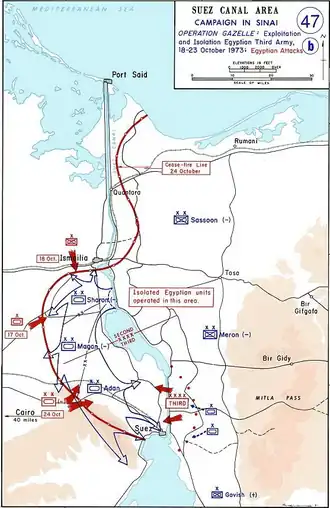 Op 8 oktober liep een poging van Israël om zelf het Suezkanaal over te steken vast in de Egyptische verdediging, mede door de inzet van geleide antitankraketten. Dezelfde dag begonnen Israëlische reserves de zuidelijke Golan te heroveren, wat op 10 oktober voltooid werd. Van 11 oktober af dreven ze het verslagen Syrische leger richting Damascus. Het arriveren van een Iraakse expeditiemacht voorkwam op 13 oktober echter een totale ineenstorting van Syrië en het noordelijk front zou tot 22 oktober vrij stabiel blijven. Sadat trachtte op 14 oktober Syrië te ontlasten door een groot offensief in de Sinaï maar verloor daarbij een aanzienlijk aantal tanks. In de avond van 15 oktober maakte een Israëlische eenheid daar gebruik van door achter de Egyptische linies langs te glippen en een oversteekpoging te beginnen. Na zware strijd om de aanvoerwegen naar het oversteekpunt, zette Israël het grootste deel van zijn strijdmacht in de Sinaï over het Suezkanaal. Het begon de hele rechterflank van het Egyptische leger te omsingelen. De Veiligheidsraad legde op 22 oktober een wapenstilstand op. Israël rukte tot 25 oktober naar het zuiden op en voltooide de omsingeling van het Egyptische Derde Leger waarna opnieuw een staakt-het-vuren inging.