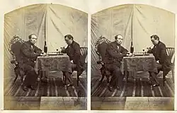 Zelfportret uit 1864 van een 42-jarige J.E. van Rheden, schakend met een van zijn hulponderwijzers.[20] Dit is een complete stereofoto waar beide afbeeldingen met dezelfde voorstelling vanuit een iets andere hoek te zien zijn.