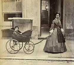 Een van de allereerste foto's van Van Rheden: Henriette, zijn tweede dochter, een kleine zes jaar oud in een kinderwagen, getrokken door Anna Maria Jacoba Nieuwpoort. Zij woonde vermoedelijk als kostgangster enkele jaren in bij de familie Van Rheden.[11]