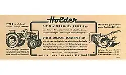 - 1930: C.F. Holder & Zn. presenteert de enkelassige tractor, uitgerust met een enkelwielige rem, verstelbare veerpoten, poelie en krachtafnemer. Deze machine wordt onderscheiden met een DLG-medaille en is eveneens te zien in het Duitse Museum voor Technologie.