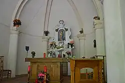 Binnenaanzicht met het altaar. Het gepolychromeerde Mariabeeld dateert uit het eind van de 15e eeuw.