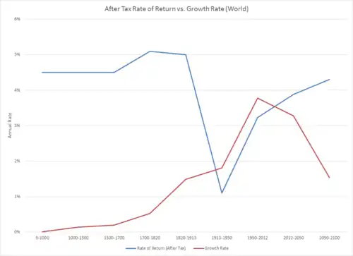 De historische uitzondering op de regel r > g is de periode vanaf ca. de Eerste Wereldoorlog. Het vermogensrendement is in deze periode sterk gedaald door een aantal factoren, waaronder de kapitaalvernietiging in de beide wereldoorlogen en de belastingen die overheden oplegden om die oorlogen mee te bekostigen. De groei steeg tegelijkertijd, met name door een explosieve bevolkingsgroei, die tegelijk het vermogen nivelleerde: meer kinderen per gezin houdt een deling van erfenissen in. De uitzonderlijke situatie van de twintigste eeuw, betoogt Piketty, is ten onrechte aangezien voor een wetmatigheid (de Kuznetscurve) en is al aan het verdwijnen. Voor de eenentwintigste eeuw voorspelt hij een r van ongeveer 5%, een g eerder rond de 1,5%.