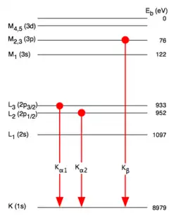 Er zal dus in zeer korte tijd een elektron uit een hogere schil het 'gat' in de baan opvullen. Hierbij zendt het atoom te veel energie uit onder de vorm van karakteristieke straling. De straling noemt men karakteristiek omdat de golflengte, die overeenkomt met het energieverschil, typerend is voor de specifieke mogelijke elektronenovergangen en dus karakteriserend is voor het specifieke ion. Hiermee is het dan ook mogelijk een materiaal te karakteriseren.[1] Dit wordt toegepast in de volgende analysetechnieken:
