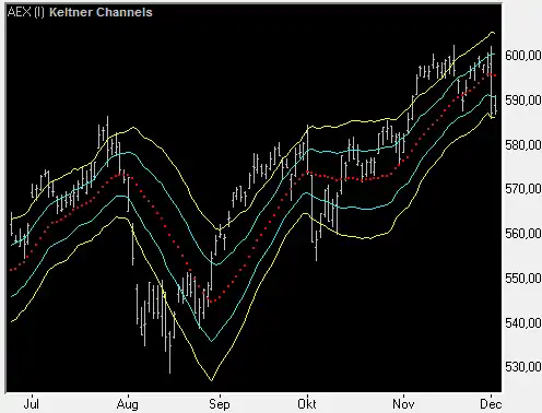 De door Linda Raschke gemodificeerde berekening van de Keltner Channel verloopt als volgt. Eerst wordt de Exponentiële Moving Average berekend met periode 20: EMA(20). Dan de Average True Range: de ATR. De Keltner Channel wordt nu berekend uit:
