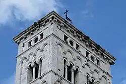 De kerk heeft kleine loggia's, zuilengangen en gedraaide zuilen op de gevel. Boven een rij van zeven blinde bogen verheffen zich vier dwerggalerijen, twee over de hele breedte van de gevel, de twee bovenste alleen over het middenstuk. De zones boven de bogen zijn versierd met dier- en bladmotieven van ingelegd marmer.