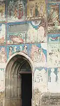 De opmerkelijkste fresco's van Dragoș Coman bevinden zich aan de buitenzijde van de kerk. Op de zuidelijke wand is een Laatste Oordeel afgebeeld (met trotse Turken met tulbanden en rijke gewaden tussen de verdoemden), samen met een Deisis (gebed) en een Hymne. Op de apsis is het Gebed van alle heiligen afgebeeld. Op de westelijke muur zijn 85 afzonderlijke scènes afgebeeld, waaronder een reeks met de Genesis en de levens van de heiligen Joris, Demetrius, Nicetas en Parasceva.