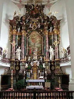 In een aantal kerken bevindt zich op of boven het altaar een altaarstuk. Dit kan een schilderwerk zijn, vaak een veelluik. Ook zeer grote houten altaarstukken, welke zowel van schilderwerk als van beelden zijn voorzien, komen voor, bijvoorbeeld in Spaanse kerken.