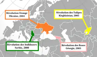 - Dit artikel of een eerdere versie ervan is een (gedeeltelijke) vertaling van het artikel Colour revolution op de Engelstalige Wikipedia, dat onder de licentie Creative Commons Naamsvermelding/Gelijk delen valt. Zie de bewerkingsgeschiedenis aldaar.