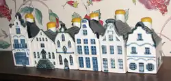 Sinds 1952 deelt KLM Delfts blauwe huisjes uit aan de passagiers van de World Business Class. De huisjes zijn met name de eerste jaren ontworpen naar voorbeeld van historische grachtenpanden, maar bestaan niet echt. Later is sprake van replica's van bijzondere gebouwen in Nederland, Caribisch Nederland, Aruba, Curaçao en Sint Maarten. De eerste jaren mochten er volgens internationale regels alleen cadeaus met een waarde van maximaal 75 cent gegeven worden. Dit leidde tot een rechtszaak tegen KLM vanwege het uitdelen van de huisjes die een hogere waarde hadden. KLM won de rechtszaak door te pleiten dat het geen cadeaus waren, maar drankjes van het huis. In de regelgeving stond immers nergens dat drankjes in een glas geserveerd dienden te worden. De huisjes zijn collector's items geworden.