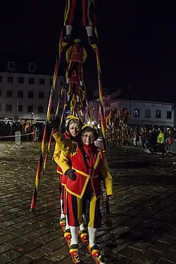 De steltenlopers lopen op stelten die in lengte variëren van 1 meter onder de voet tot maximaal 4,11 meter onder de voet. De hoogste stelten wegen 10 tot 12 kilogram en zijn enkel weggelegd voor de meest ervaren leden, na jaren oefening.[1] De blokkenlopers marcheren per drie in drie paar klompen die op ski's zijn bevestigd. Ze moeten synchroon blijven marcheren, zo niet vallen ze om.