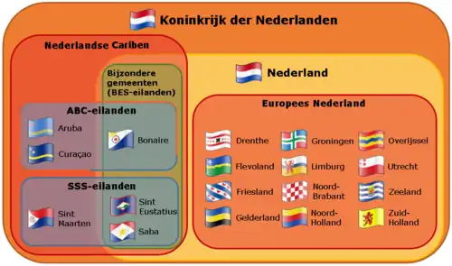 - ↑ L. Prakke & C.A.J.M. Kortmann (red.): Het staatsrecht van de landen van de Europese Unie, blz. 561 e.v.: "Het Koninkrijk der Nederlanden is een verband met federale trekken tussen Nederland (het 'Rijk in Europa'), de Curaçao, Sint Maarten en Aruba. [...] De onderdelen (de 'landen') van het Rijk zijn autonoom, zo kennen ze elk een eigen staatsregeling. [...] De hoogste bronnen van constitutioneel recht zijn het Statuut voor het Koninkrijk der Nederlanden van 1954, en enkele internationale verdragen inzake de mensenrechten."