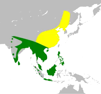 Deze soort komt voor van Pakistan en India, Sri Lanka oostelijk tot Indonesië en noordelijk tot China en Rusland en telt twee ondersoorten:[2]