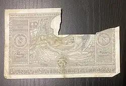 Het biljet is deels afgescheurd waardoor het niet volledig meer intact is. Het is zwaar bevuild met kreuken. |