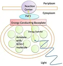 Fotosynthetische antennes bestaan uit een collectie biologische pigmenten zoals (bacterie)chlorofylen en carotenoïden, meestal bij elkaar gehouden door eiwitcomplexen. Wanneer de pigmenten licht vangen ontstaat er een collectieve excitatie, ook wel “excitons” genoemd. Deze excitons vinden hun weg naar het reactiecentrum met behulp van kwantum coherentie. Er is veel onderzoek gedaan naar het Fenna-Matthews-Olson (FMO) complex.[13] Pas in 2007 werd daarbij aangetoond dat niet alleen bij lage temperaturen maar ook bij kamertemperatuur een coherentie gemeten kon worden die zelfs van langere duur was, wel 600 femtoseconden. Er wordt daarom ook wel gedacht dat middelmatige ruis niveaus van de omgeving waarin de complexen liggen zelfs bijdragen aan de duur van de coherentie.[1] Coherentie staat de excitons toe de snelste weg te vinden naar het reactiecentrum voordat de energie verloren gaat in fluorescentie.