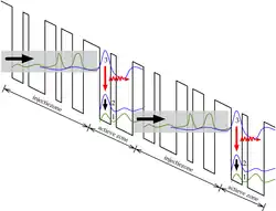 Een typische structuur van een kwantumcascadelaser staat afgebeeld in de figuur. Deze structuur is zo opgebouwd dat het cascade-effect bekomen wordt. De op en neer zigzaggende zwarte lijn op de figuur zijn de kwantumputten. De opbouw is periodiek en bevat afwisselend een injectiezone en een actieve zone (ook wel emissiezone genoemd). Een typische kwantumcascadelaser kan 25 tot 75 periodes bevatten. In de actieve zone 'valt' het elektron in een van haar kwantumputten van niveau 3 naar niveau 2 waarbij het een foton (zigzagpijl) uitzendt. De overgang van niveau 2 naar 1 gebeurt zonder fotonemissie. In de injectiezone, die als een soort tijdelijke opslag van elektronen dient, worden de elektronen doorgetunneld naar de volgende active zone. De populatie-inversie tussen niveau 2 en 3 komt doordat de doorgetunnelde elektronen in niveau 3 gemiddeld 2,1 ps nodig hebben vooraleer ze naar niveau 2 gaan, terwijl elektronen in gemiddeld 0,3 ps verspringen van niveau 2 naar 1.