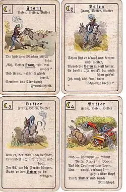 Hiernaast staat een kwartet uit een spel dat gewijd is aan de verhalen van Wilhelm Busch. De vier kaarten Franz, Nichten, Neef en Boter komen uit het verhaal Vetter Franz auf dem Esel. Bovenaan elke kaart staat de naam van de kaart, en daaronder de naam van de drie andere kaarten uit dat kwartet. Dit is belangrijke informatie voor de spelers. Daarom is het belangrijk dat de spelers kunnen lezen. De Nederlandse tekenaar Dick Bruna ontwierp een kwartetspel waarop alleen plaatjes staan, waardoor dit spel ook voor kleinere kinderen geschikt is. Dit spel is ook ideaal voor mensen die dyslectisch zijn. Zij hoeven dan immers geen woorden te lezen.