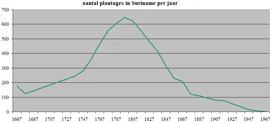 De tweede helft van de 18e eeuw kenmerkte zich door een overmatige steun van de plantages met kredieten uit Nederland en een naar verhouding te luxueus leven op de plantages in Suriname. Hierop volgde in 1773 een beurskrach wat tot het faillissement van veel plantages in Suriname leidde. Sinds 1800 was er een aanhoudende teruggang in het aantal plantages totdat ze rond het midden van de 20e eeuw geheel verdwenen.[5]